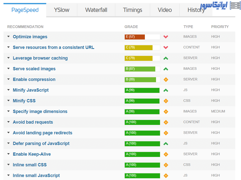 یکی دیگر از پارامتر های مهمی که در GTmetrix با آن مواجه هستید، پارامتر YSlow است، این پارامتر بیشتر مربوط به درخواست هایی است که وب سایت شما رد و بدل میکند. در سربرگ مربوط به این پارامتر، موارد متعددی آورده شده است که میتوانید هر کدام را به طور جداگانه مورد بررسی قرار دهید.